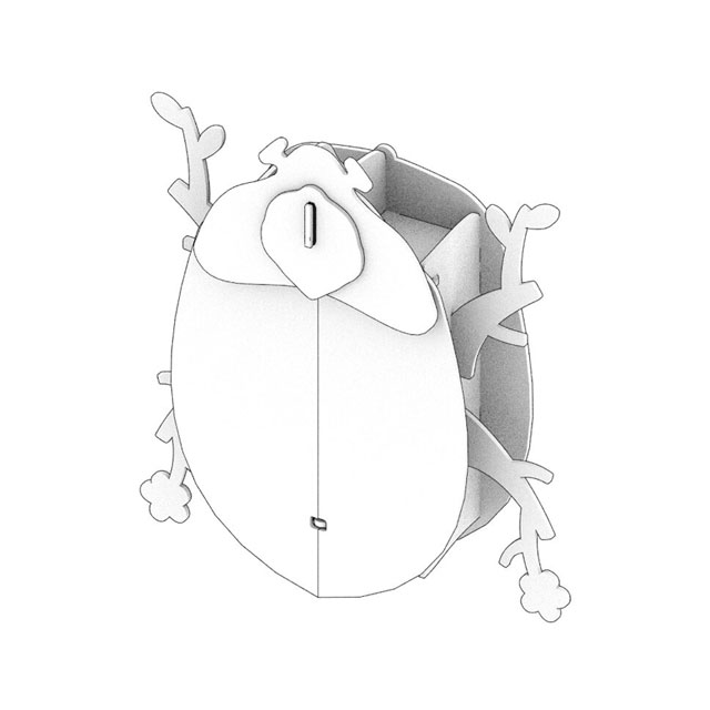 昆虫をモチーフにした、MDF板を組み立ててつくる壁掛けオブジェです。羽の部分が開閉できるようになっており、内部にはフック(3個)がついていますので、キーボックスとしてお使いいただけます。棚板を取り付けて小物入れとしてお使いいただくことも可能です。また、脚のパーツを取り付けずに、丸いコロンとしたフォルムを楽しむこともできます。
